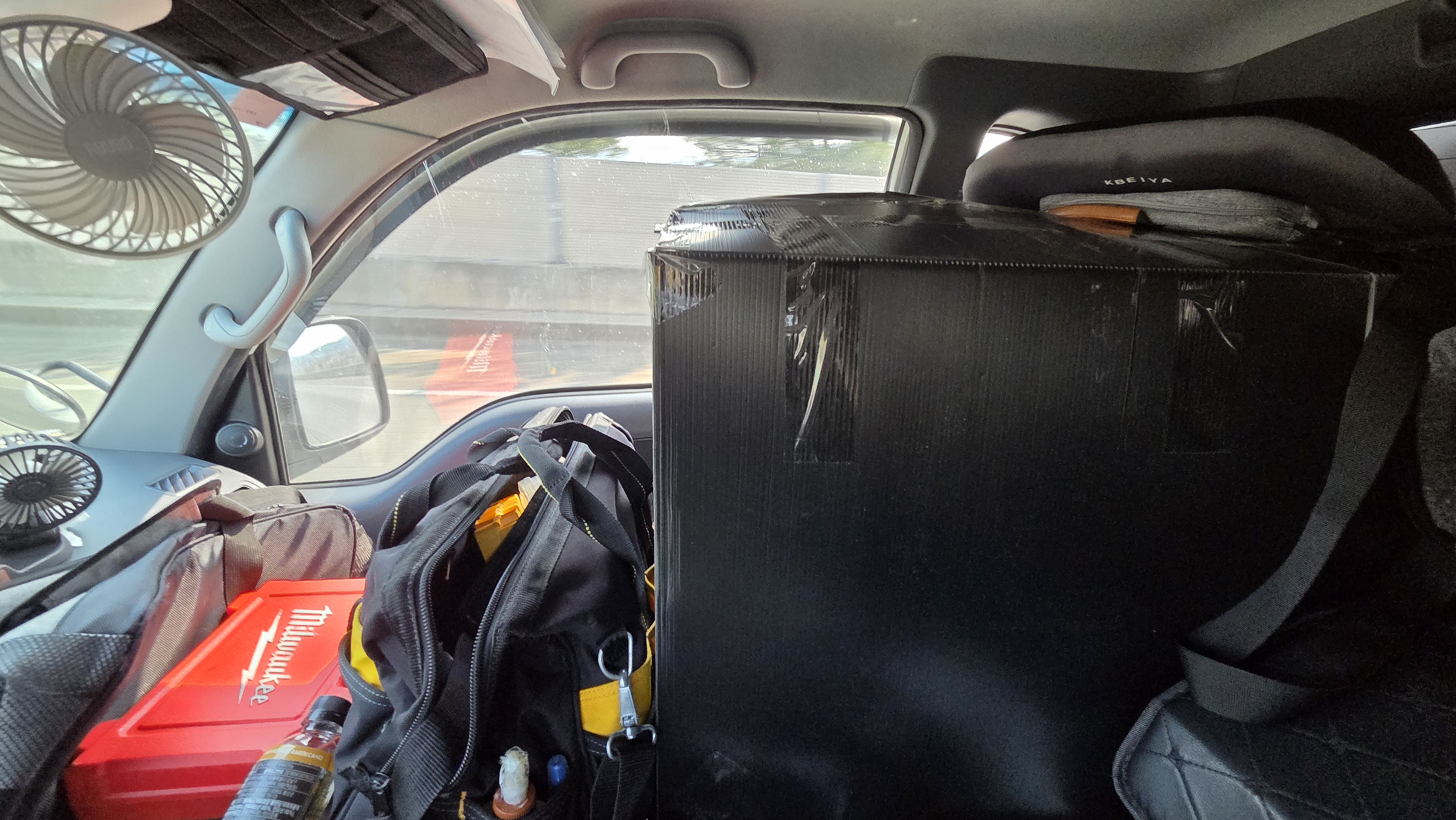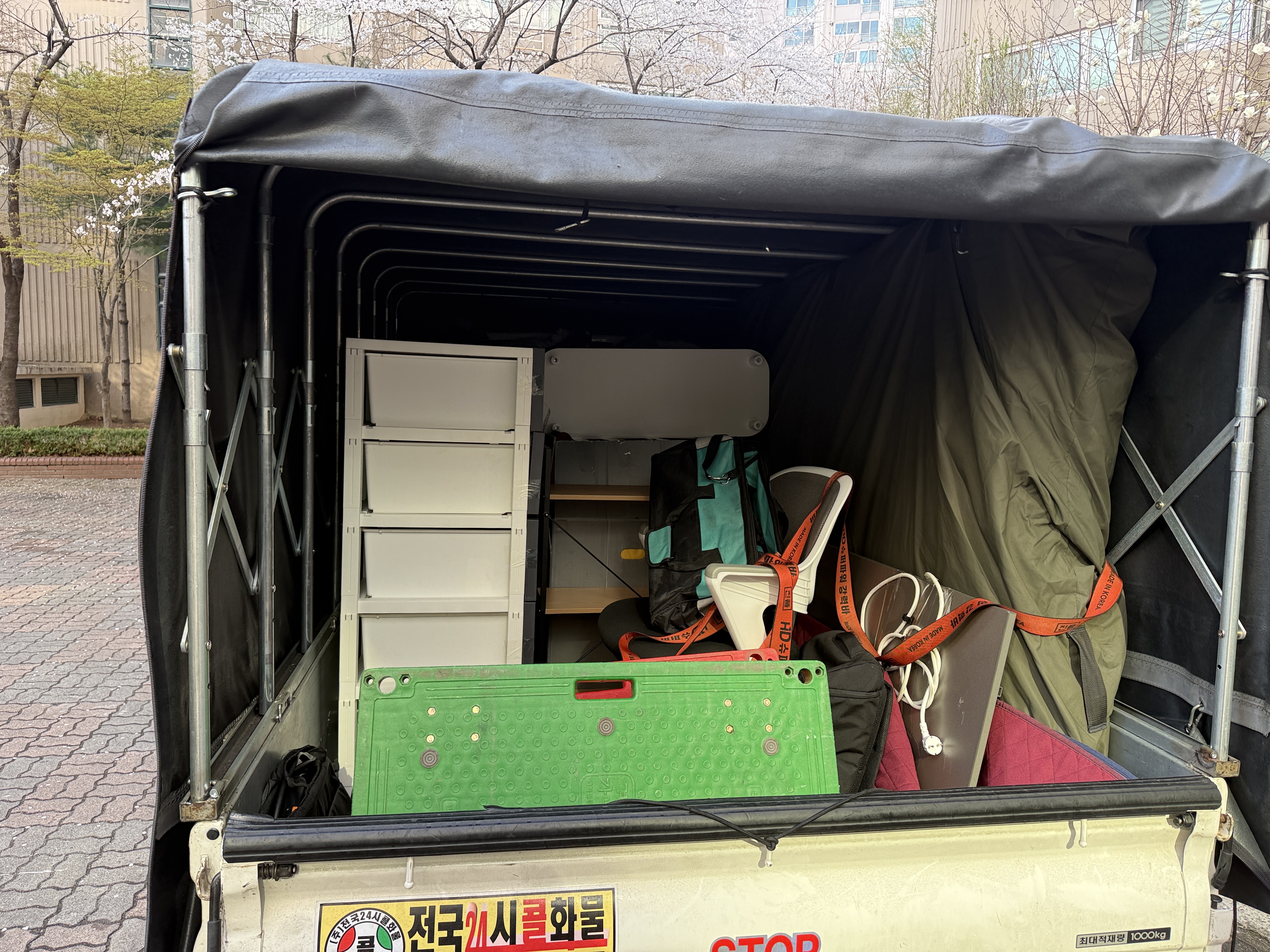 이제 20분 거리에 있는 고객님 여자친구분 댁에서 박스 6개 정도를 더 실어야 했습니다. 함께 차를 타고 이동 하면서 이런 저런 사는 이야기를 나누다 보니 금세 도착! 그런데 6개라고 하셨던 박스는 어찌나 크던지! 5개를 싣고 나니 짐칸이 꽉 차 버렸습니다. 위에 높게 쌓으면 구리까지 가는 동안 바람의 영향을 많이 받아 연비가 안 좋아질까 봐, 부득이하게 제 옆 조수석에 남은 박스를 실었습니다. 좁았지만 뭐, 괜찮아요!